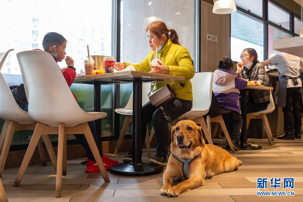 祝愛葉和兒子在餐廳吃飯的時候,導盲犬“多多”靜靜地趴在祝愛葉身邊(3月13日攝)。
