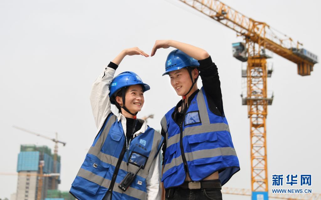 4月28日,丈夫鐘維(右)和妻子陳小枝在工地留影。他們?cè)谕话嘟M,丈夫是塔吊操作員,妻子是塔吊指揮員。在武漢長江文創(chuàng)產(chǎn)業(yè)園項(xiàng)目工地上,兩人長期搭班,配合默契。