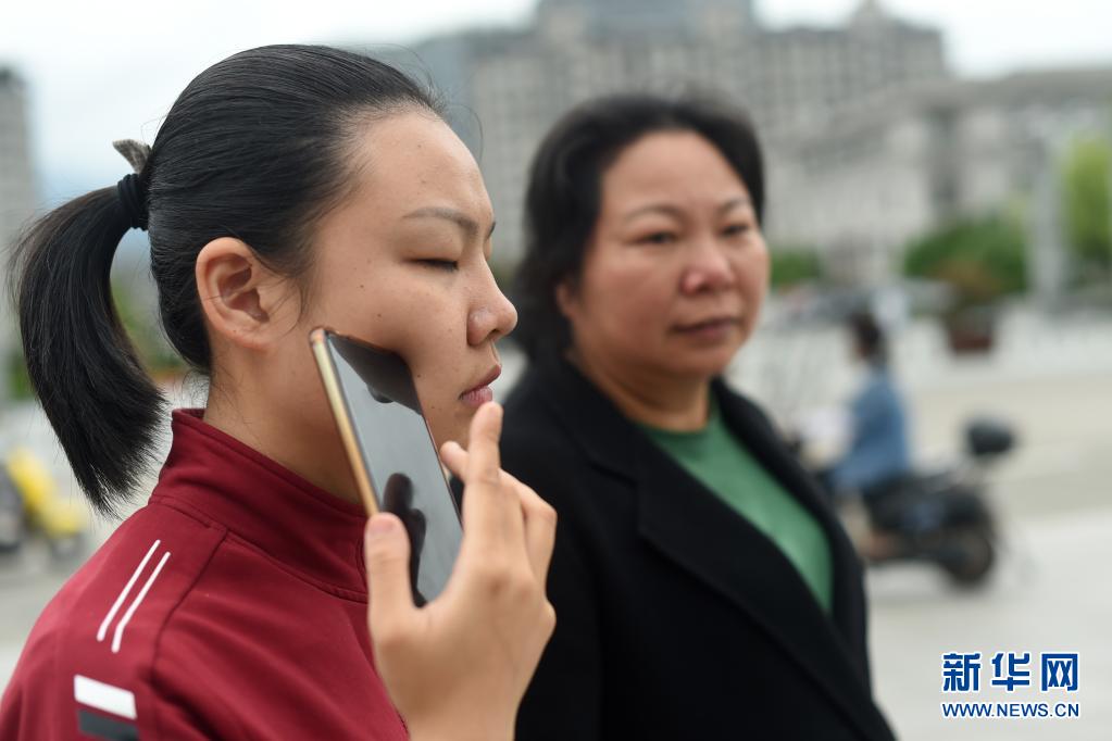 4月28日,葉景芬(前)和媽媽林鳳玉走在龍泉市街頭時接聽電話。新華社記者 韓傳號 攝