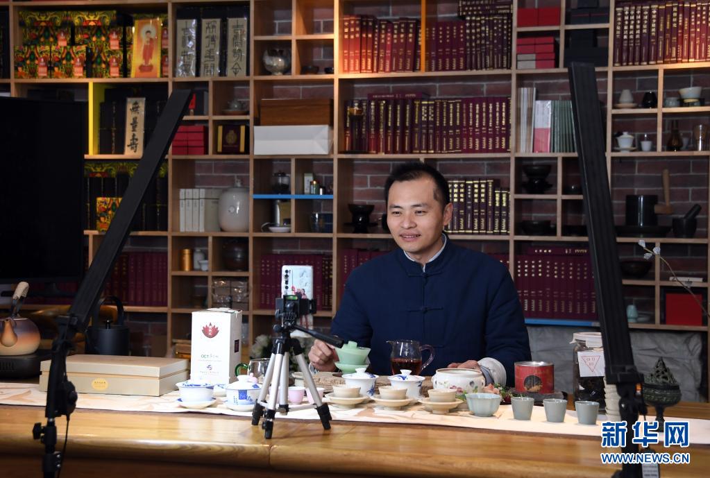 李卓澄在“小茶館”中通過視頻直播的方式向觀眾介紹茶知識(4月29日攝)。新華社記者 趙婷婷 攝