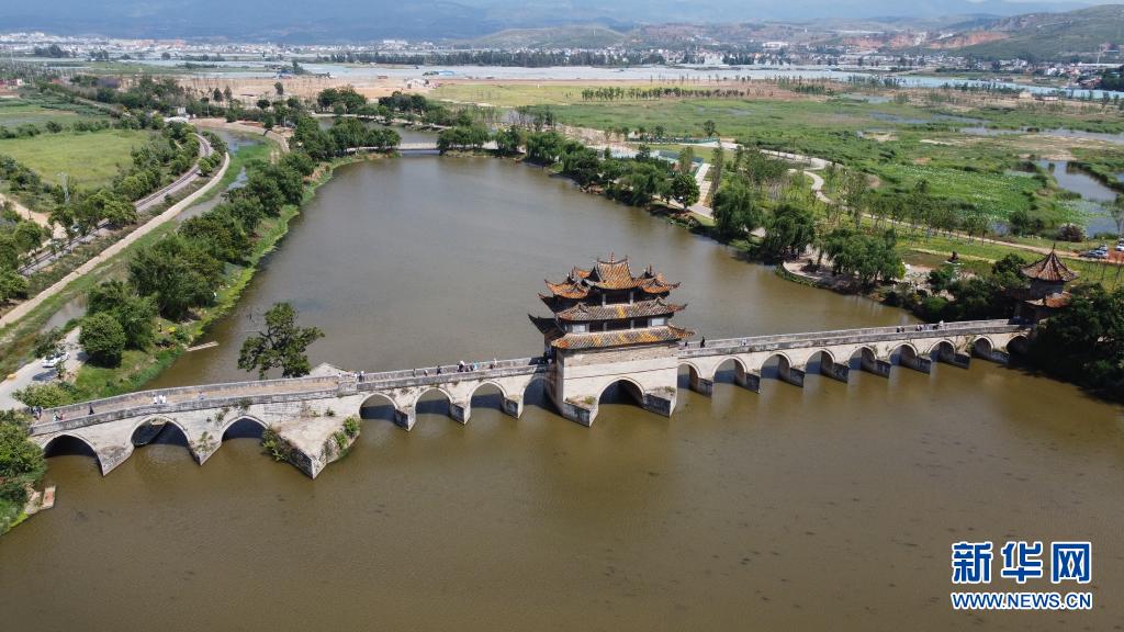 5月3日,游客在云南省紅河哈尼族彝族自治州建水縣建水古城雙龍橋景區(qū)游覽(無(wú)人機(jī)照片)。新華社發(fā)(楊俊鵬 攝)