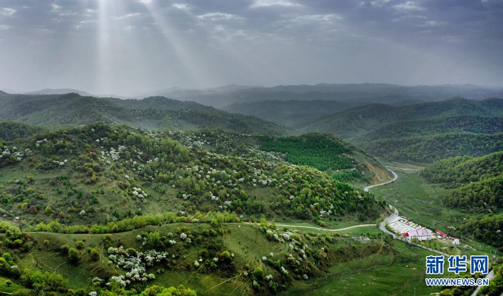 陽光照耀在陜西省寶雞市隴縣關(guān)山草原旅游風(fēng)景區(qū)鮮花盛開的山坡上(5月4日攝,無人機(jī)照片)。新華社記者 陶明 攝
