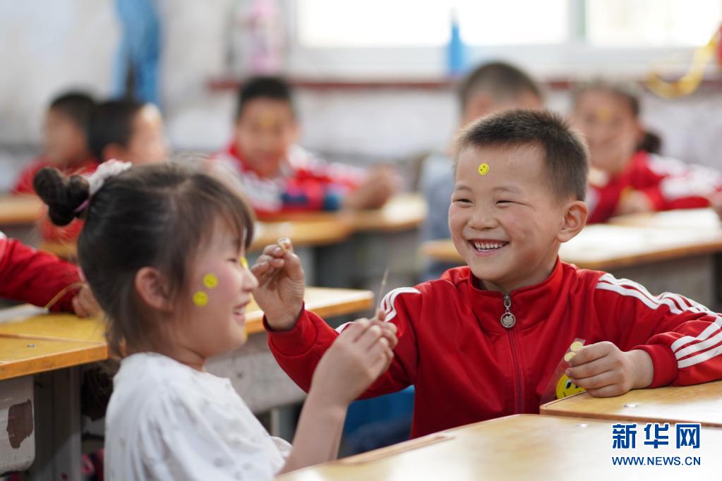5月7日,河北省邢臺市內(nèi)丘縣南賽中心小學的學生在教室做貼笑臉游戲。世界精神衛(wèi)生組織將每年的5月8日定為“世界微笑日”,希望通過微笑促進人類身心健康,增進社會和諧。新華社發(fā)(劉繼東 攝)