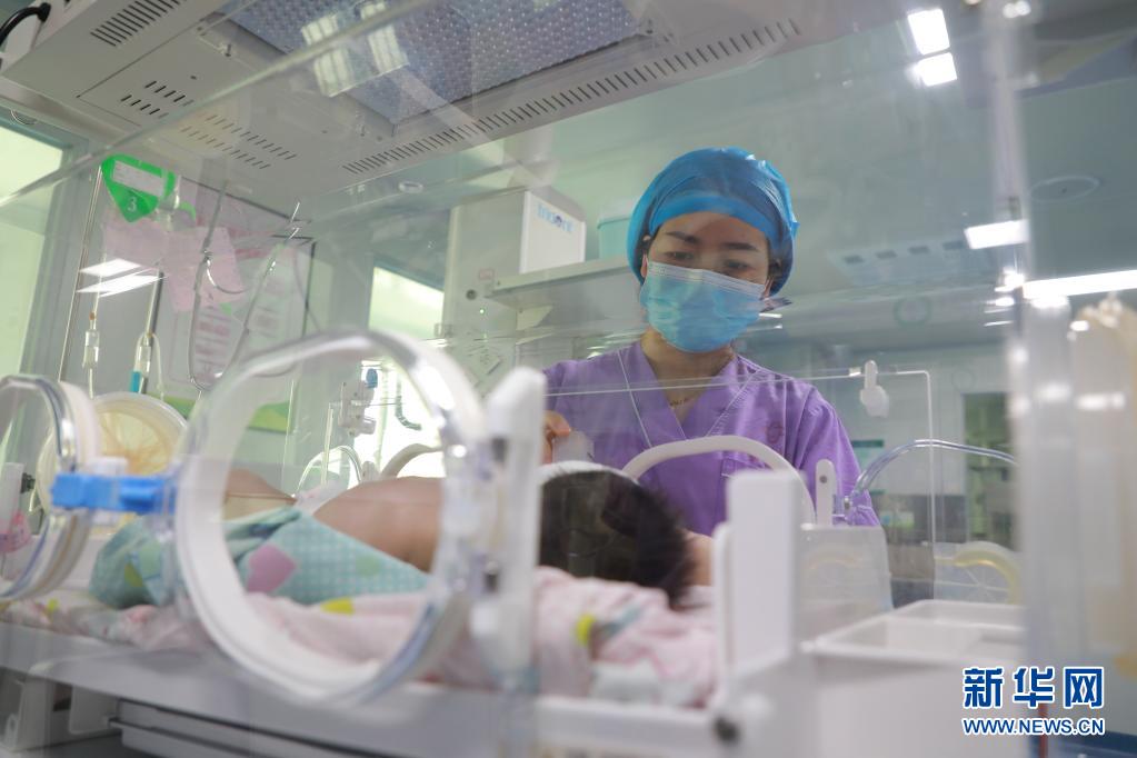 5月11日,湖南省永州市東安縣人民醫(yī)院新生兒科護士為新生兒進行日常護理。