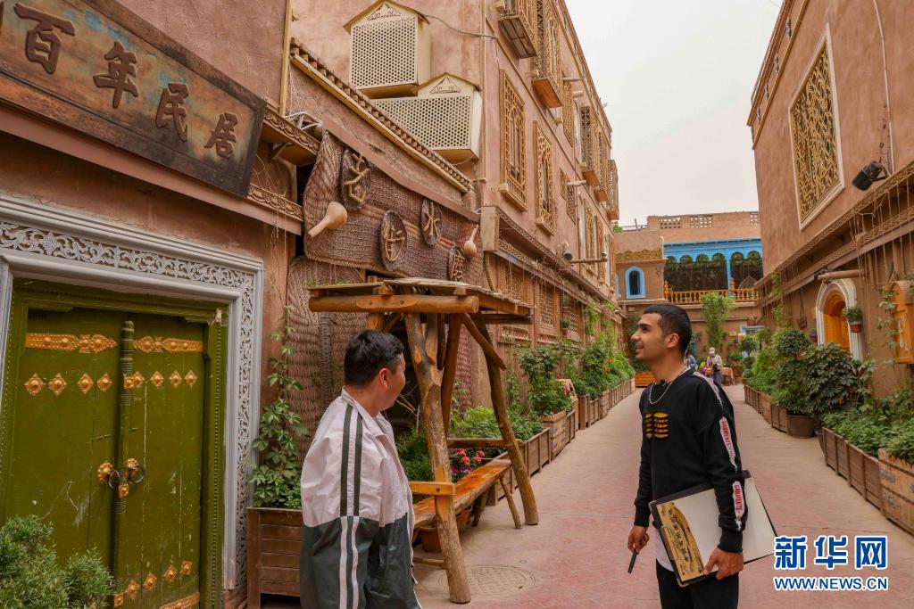 麥麥提吐?tīng)栠d江·麥麥提依明(右)和朋友在新疆喀什古城景區(qū)尋找創(chuàng)作素材(5月6日攝)。新華社記者 胡虎虎 攝