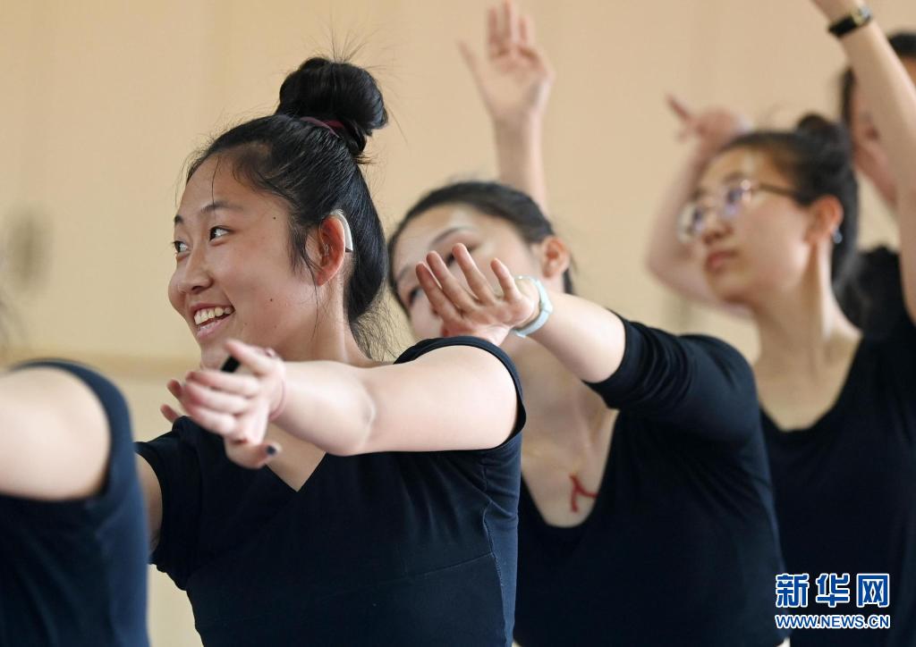 天津理工大學(xué)聾人工學(xué)院的舞蹈隊員們在學(xué)院的排練廳里練習(xí)舞蹈動作(5月8日攝)。新華社記者 李然 攝