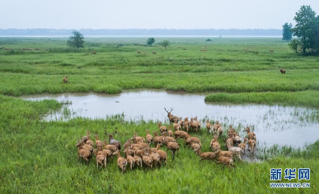 5月17日,一群麋鹿在石首麋鹿國(guó)家級(jí)自然保護(hù)區(qū)內(nèi)活動(dòng)(無人機(jī)照片)。新華社記者 肖藝九 攝