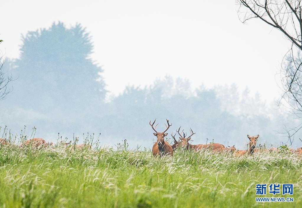 5月17日,一群麋鹿在石首麋鹿國(guó)家級(jí)自然保護(hù)區(qū)內(nèi)活動(dòng)。新華社記者 肖藝九 攝