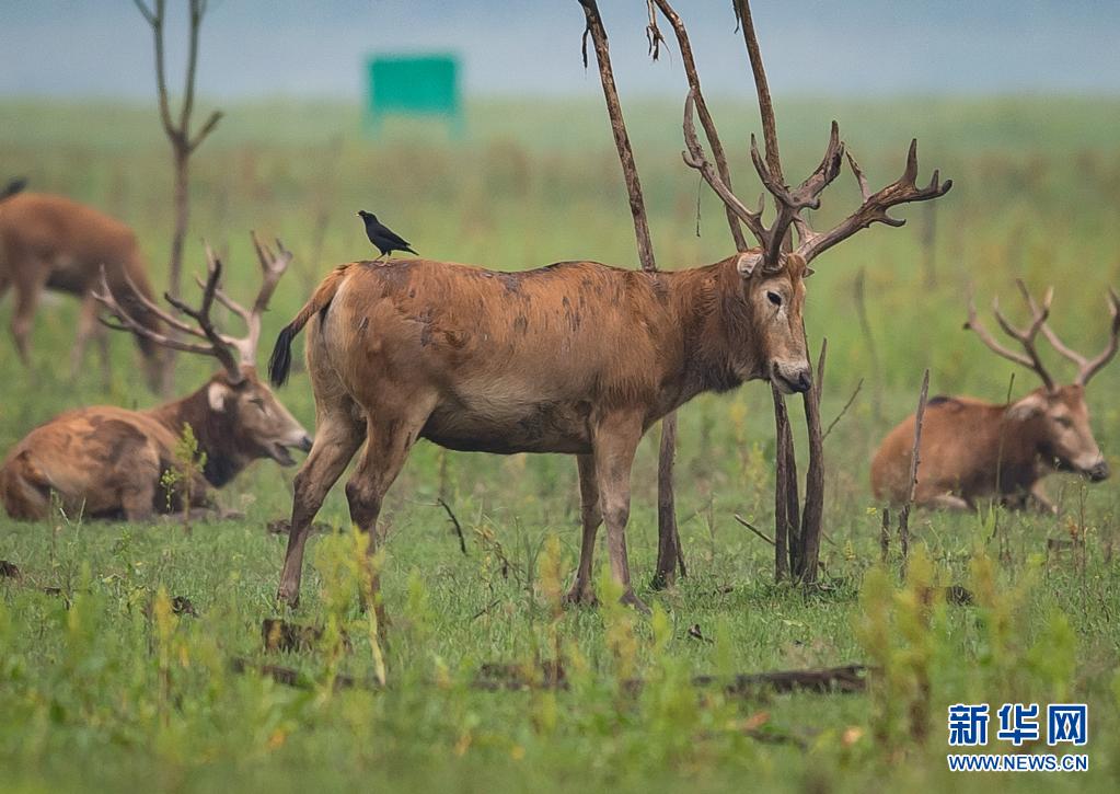 5月17日,在石首麋鹿國家級自然保護區(qū),一只鳥在麋鹿的背上駐足。新華社記者 肖藝九 攝