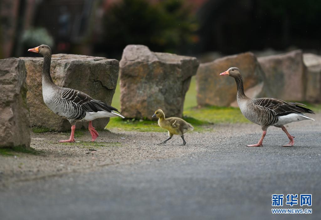 5月19日,幾只灰雁在德國法蘭克福的美茵河畔覓食。