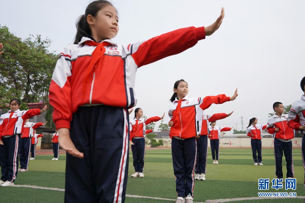 5月19日,邢臺(tái)市內(nèi)丘縣實(shí)驗(yàn)小學(xué)學(xué)生在操場(chǎng)上練習(xí)武術(shù)操。