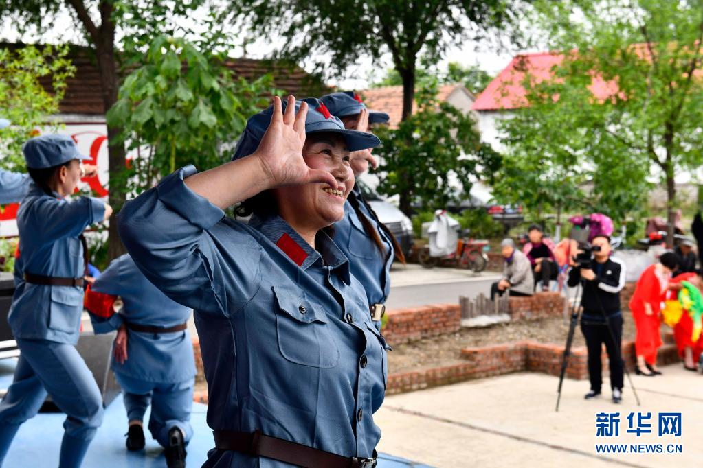 5月21日,在棗莊市臺兒莊區(qū)馬蘭屯鎮(zhèn)西張莊村,“學(xué)黨史惠民”文藝小分隊為群眾表演節(jié)目。