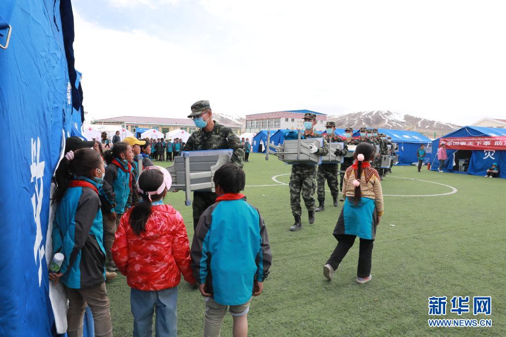 5月24日,武警青??傟?duì)果洛支隊(duì)機(jī)動大隊(duì)排長張國睿(前一)和戰(zhàn)友為花石峽鎮(zhèn)藏文中心寄宿制小學(xué)的帳篷教室搬運(yùn)課桌。新華社記者 劉芳 攝