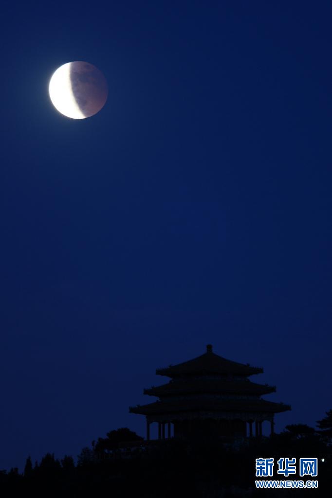 這是5月26日在北京拍攝的景山公園萬(wàn)春亭和月食。