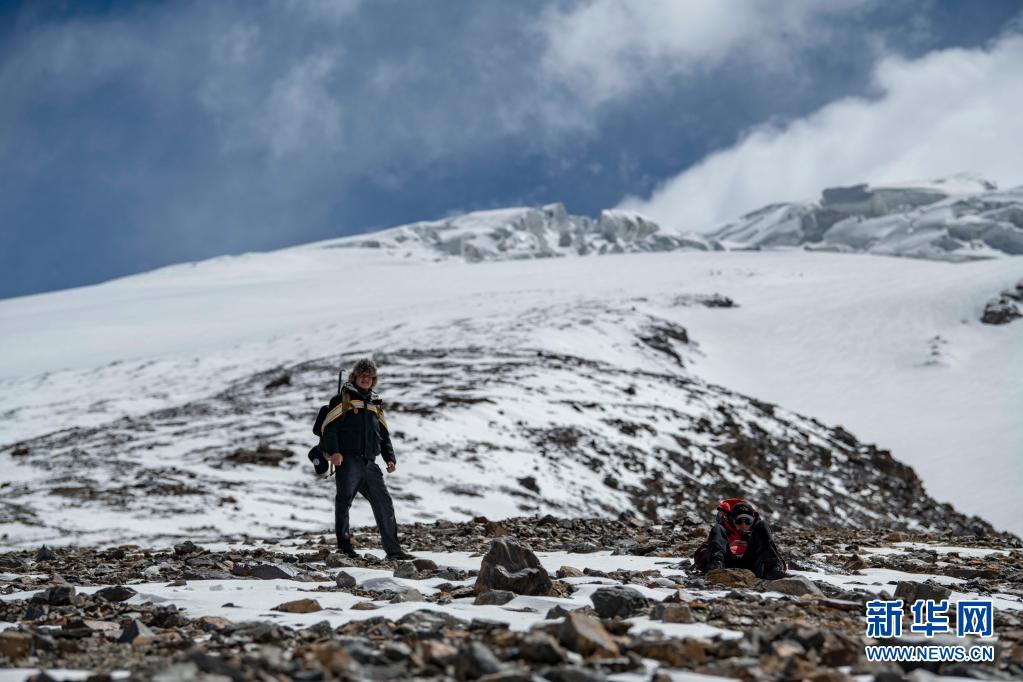翻越一處險坡后,別克米爾扎·圖爾達(dá)力(左)和同伴庫爾班巴依·努爾麥麥提在休息(5月15日攝)。新華社記者 胡虎虎 攝