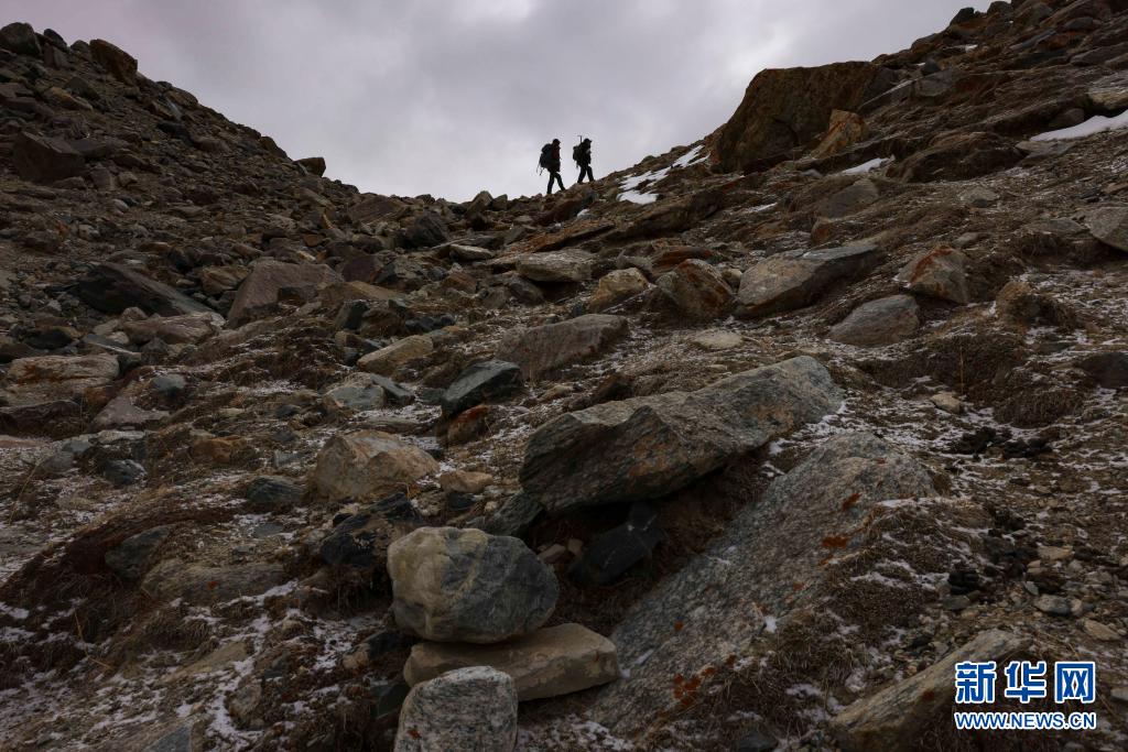 在慕士塔格峰大本營(yíng)附近,別克米爾扎·圖爾達(dá)力(右)和同伴庫爾班巴依·努爾麥麥提翻越一處陡坡(5月16日攝)。新華社記者 胡虎虎 攝