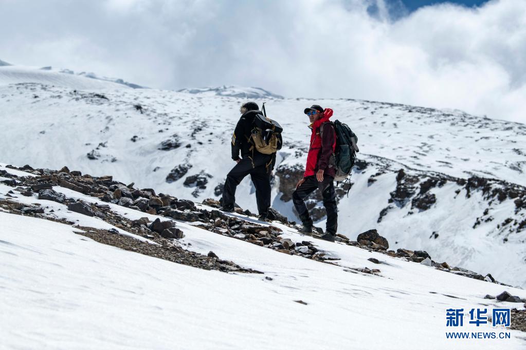 在當天的適應(yīng)性訓練中,別克米爾扎·圖爾達力(左)和同伴庫爾班巴依·努爾麥麥提行進在慕士塔格峰海拔約5000米的山路上(5月15日攝)。新華社記者 胡虎虎 攝
