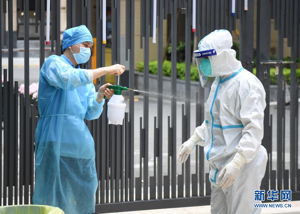 5月27日,在廣州荔灣區(qū)白鶴洞街道一小區(qū)檢測(cè)點(diǎn),荔灣區(qū)骨傷科醫(yī)院的醫(yī)護(hù)人員給換班下來(lái)的同事噴灑消毒液。新華社記者 鄧華 攝