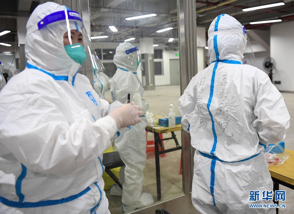 5月26日,在廣州荔灣體育館核酸檢測(cè)點(diǎn),荔灣中心醫(yī)院的醫(yī)務(wù)人員在防護(hù)服上寫上個(gè)人信息。新華社記者 鄧華 攝