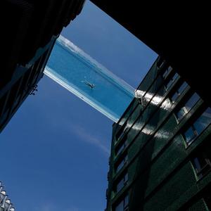 6月2日,一名男子在英國倫敦南部一個(gè)建造于兩棟公寓樓之間的“空中泳池”游泳。