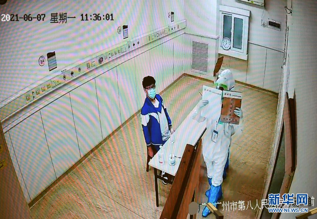 6月7日,廣東省國家教育考試指揮中心的監(jiān)控畫面顯示,上午語文考試結(jié)束后,廣州市八醫(yī)院嘉禾院區(qū)醫(yī)護人員對隔離病房考生的試卷、答題卡、稿紙等用品進行消毒后裝入試卷袋并向在醫(yī)院清潔區(qū)的視頻監(jiān)考員匯報。新華社記者 劉大偉 攝