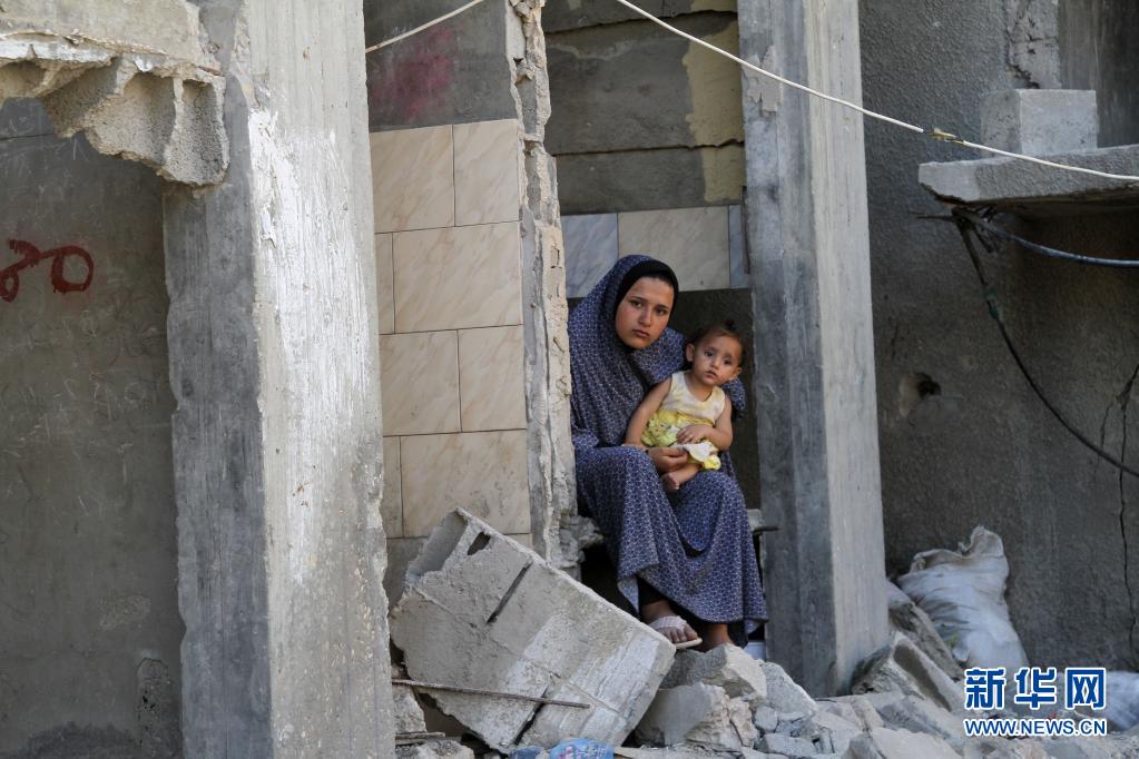 6月7日,在加沙地帶北部拜特哈嫩,巴勒斯坦人坐在遭以軍空襲損毀的建筑旁。