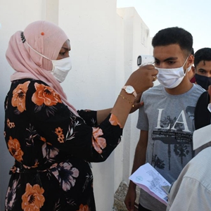 6月16日,工作人員在突尼斯首都突尼斯市一個考場外給準備參加高等學校入學考試的學生測量體溫。