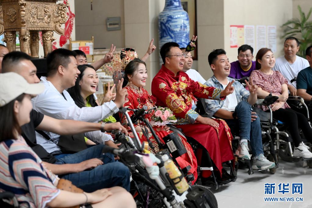 新郎周海云、新娘關(guān)美和親友們在婚禮上合影(6月15日攝)。新華社發(fā)(劉亮亮攝)