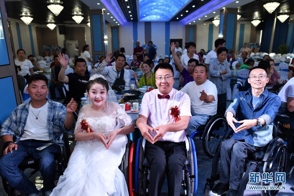 新郎周海云和新娘關(guān)美及親友們在婚禮上合影(6月15日攝)。新華社記者 詹彥 攝
