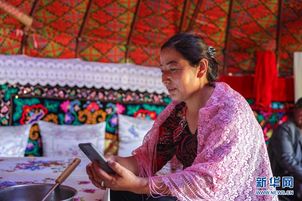在新疆裕民縣巴爾魯克山區(qū)夏牧場上,一名開辦牧家樂的牧民在氈房內用手機上網(wǎng)(6月16日攝)。