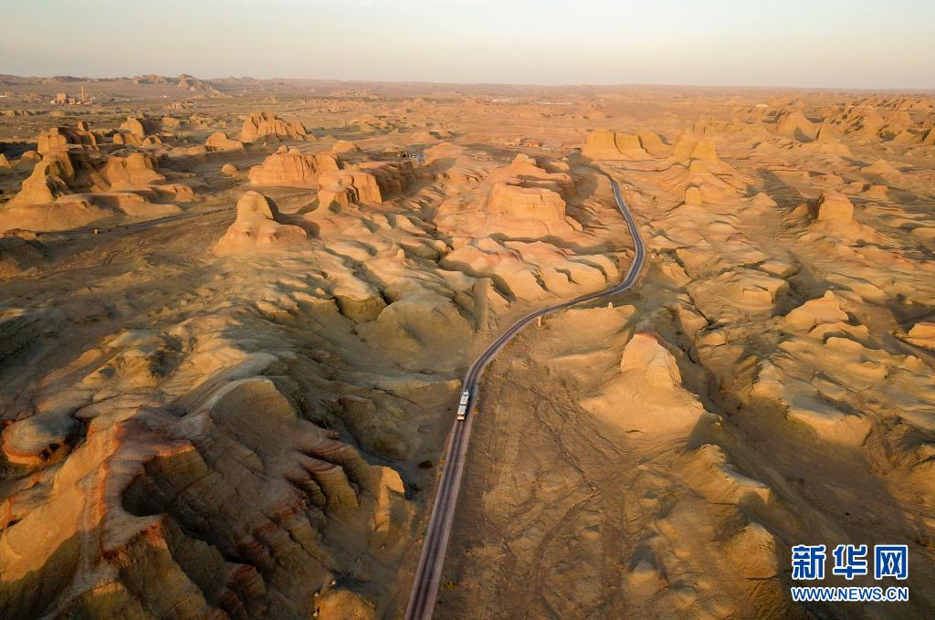 載有游客的觀光車行駛在新疆克拉瑪依烏爾禾世界魔鬼城景區(qū)內(nèi)(6月21日攝,無人機(jī)照片)。