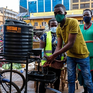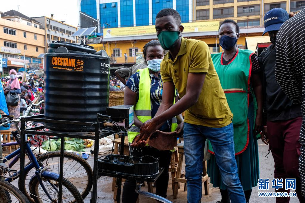 6月23日,一名男子在進(jìn)入烏干達(dá)坎帕拉的納卡塞羅市場前洗手。