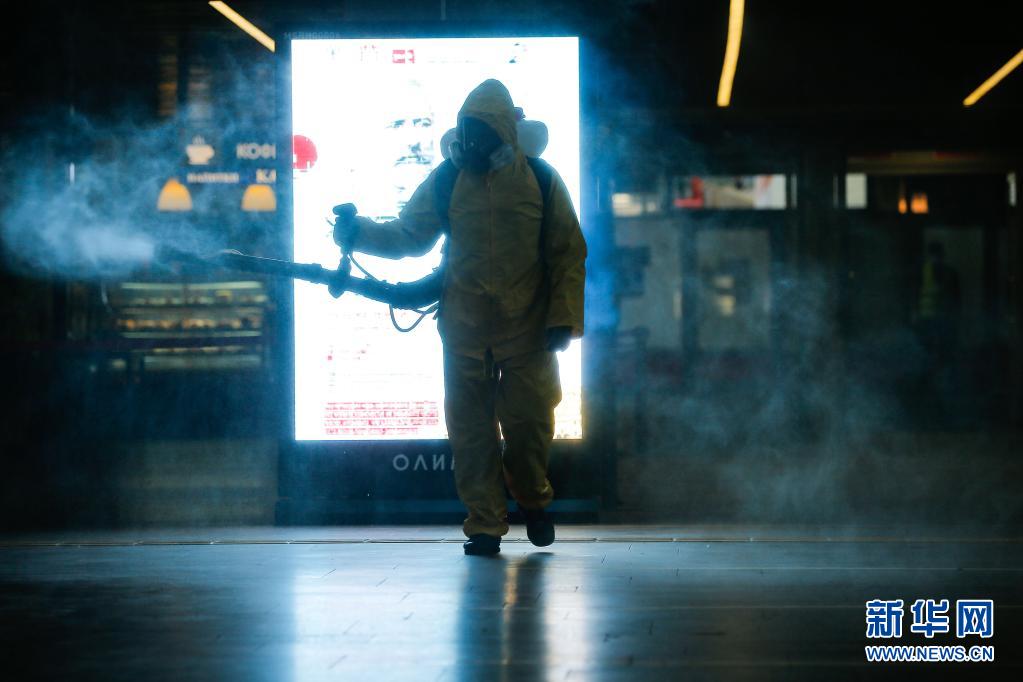 6月24日,工作人員身著防護(hù)服在俄羅斯莫斯科一個火車站進(jìn)行消毒作業(yè)。