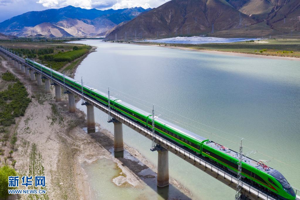 試運行的復(fù)興號列車行駛在雅魯藏布江上(6月16日攝,無人機照片)。