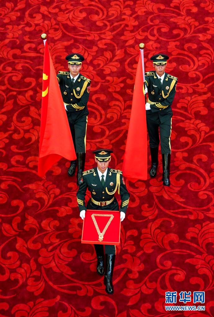 6月29日,慶祝中國共產(chǎn)黨成立100周年“七一勛章”頒授儀式在北京人民大會(huì)堂金色大廳隆重舉行。這是2名旗手高擎黨旗,1名禮兵手捧“七一勛章”,行進(jìn)到儀式現(xiàn)場(chǎng)。新華社記者 高潔 攝