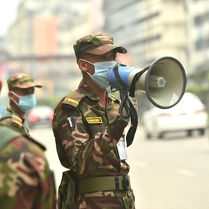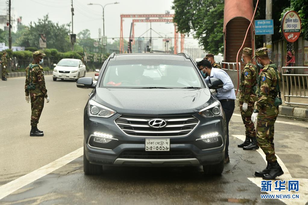 7月1日,軍人在孟加拉國(guó)達(dá)卡的街道上檢查過(guò)往車(chē)輛。