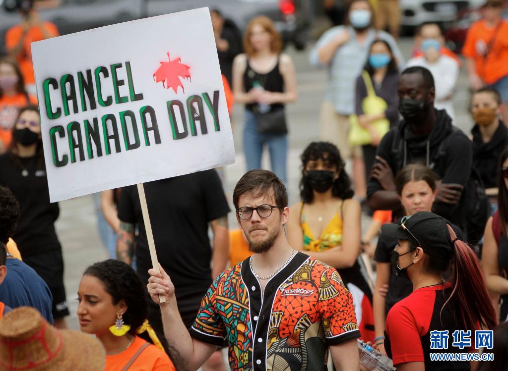 當天是加拿大日,上千名抗議者在溫哥華集會,悼念加拿大在強制“同化”原住民過程中遭到殘害的兒童,呼吁取消加拿大日的慶?;顒?。