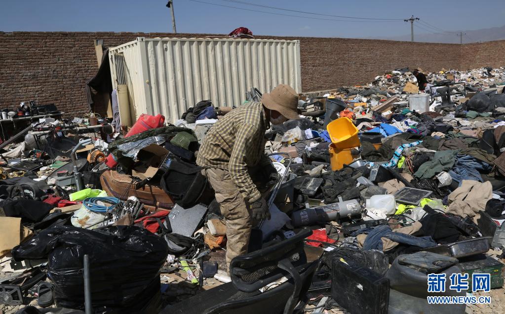 7月3日,在阿富汗帕爾萬省的巴格拉姆空軍基地附近,當(dāng)?shù)鼐用裨诿儡娺z留下的物品中回收廢舊物。