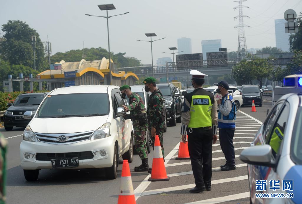 7月5日,安全人員在印度尼西亞雅加達(dá)一處檢查站檢查過往車輛。