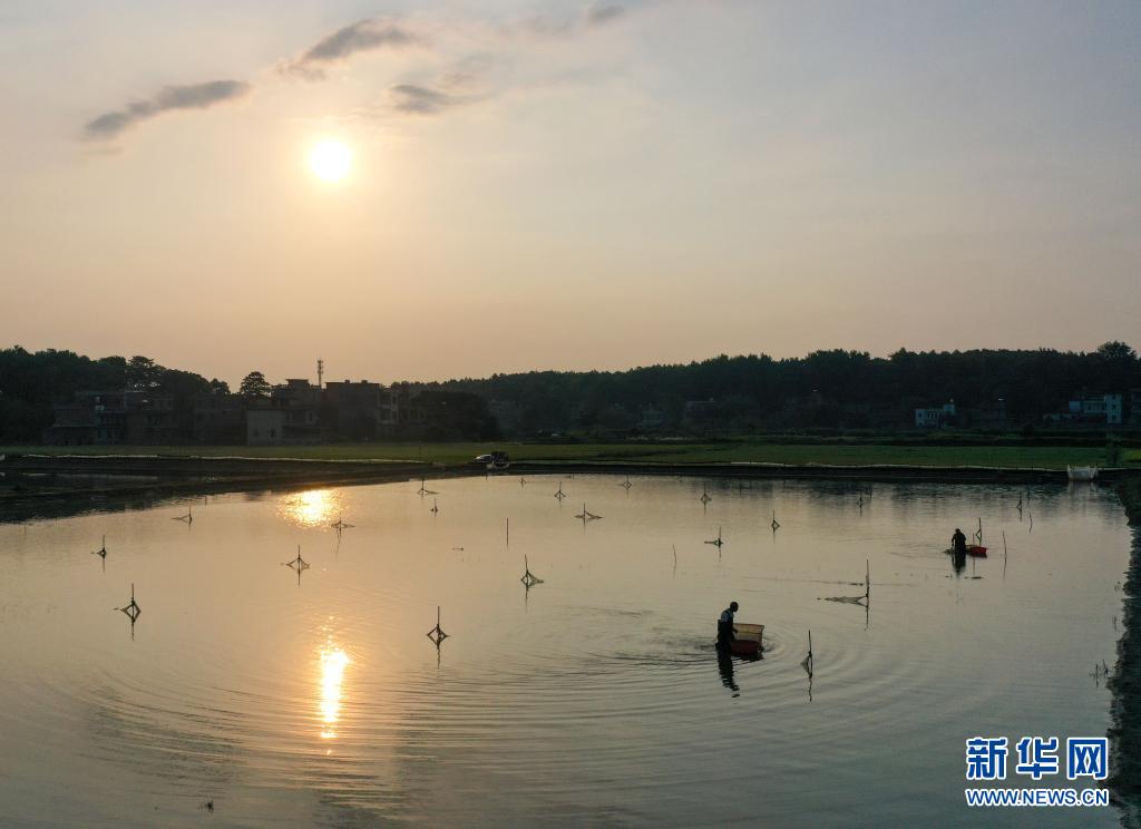 7月5日,在湖南省永州市道縣蚣?jí)捂?zhèn)洲背村,村民在收獲小龍蝦(無(wú)人機(jī)照片)。