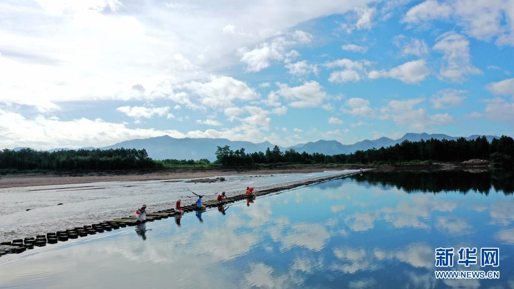 當(dāng)日,浙江省臺(tái)州市仙居縣永安溪流域水面如鏡,藍(lán)天、白云倒影水中,構(gòu)成一幅美麗的畫(huà)卷。新華社發(fā)(王華斌 攝)