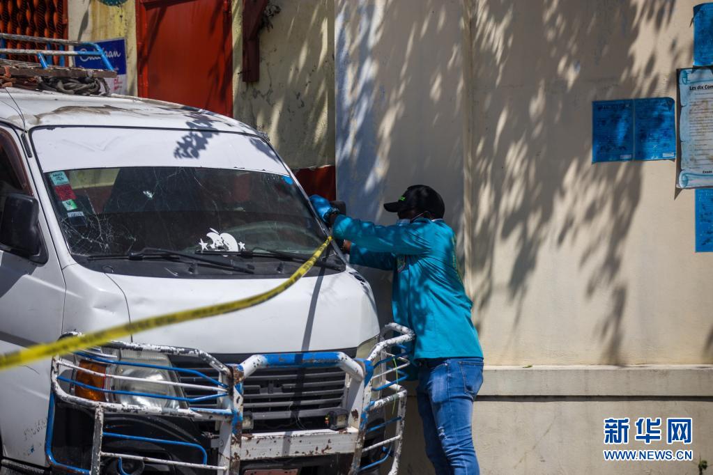 7月7日,在海地太子港,一名工作人員在海地總統(tǒng)莫伊茲的住所旁拉起警戒線。