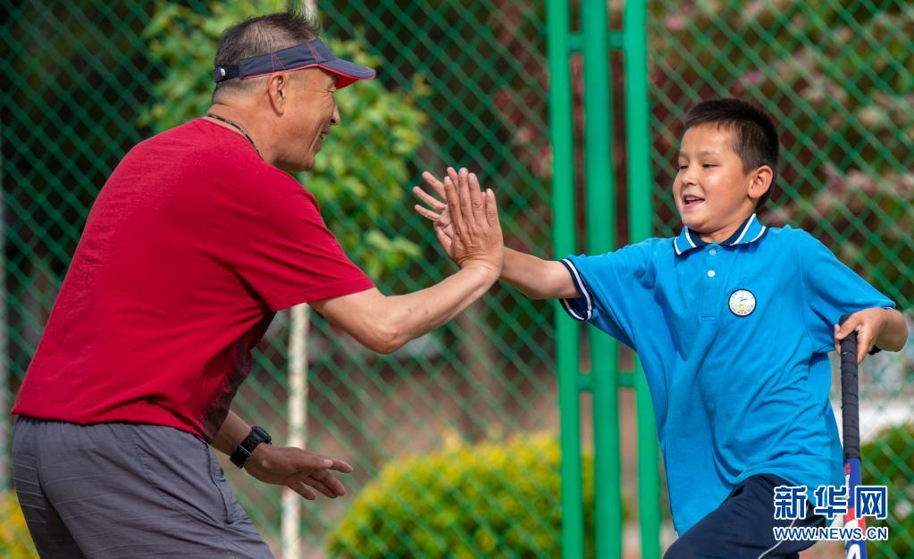 塔城市第二小學(xué)曲棍球隊的小隊員加熱斯·努爾白拉提(右)與教練杜寶柱擊掌慶祝進(jìn)球(6月11日攝)。