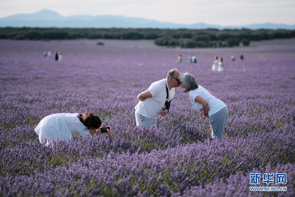 7月13日,人們?cè)谖靼嘌揽ㄋ沟倮麃?拉曼查自治區(qū)布里韋加的薰衣草田拍照。