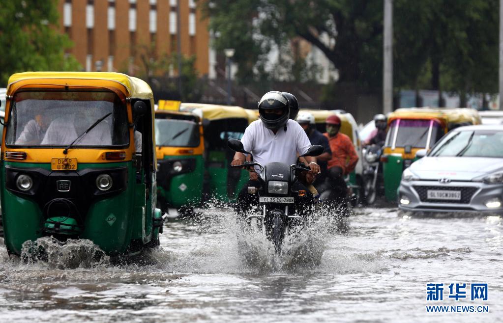 7月14日,車輛在印度新德里積水的街道上行進(jìn)。