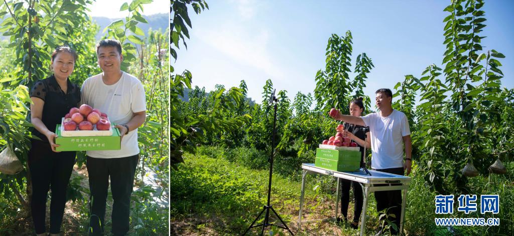 拼版照片:左圖為在山西省吉縣,武偉和妻子梁雪雪展示吉縣蘋果;右圖為武偉和妻子梁雪雪通過網(wǎng)絡(luò)直播銷售蘋果(7月9日攝)。今年30歲的武偉是山西省洪洞縣武家莊村人,2009年大學(xué)畢業(yè)后,他開過快遞公司,也做過微商。期間,他看到來自家鄉(xiāng)的蘋果存在質(zhì)高價(jià)低、銷售不暢的情況,于是開始通過電商銷售優(yōu)質(zhì)蘋果。今年以來,武偉和妻子趁著農(nóng)閑嘗試直播帶貨,沒想到短短數(shù)月粉絲量就已過萬。目前,只要天氣允許,他們每天都會直播兩場,日銷售蘋果500余單。
