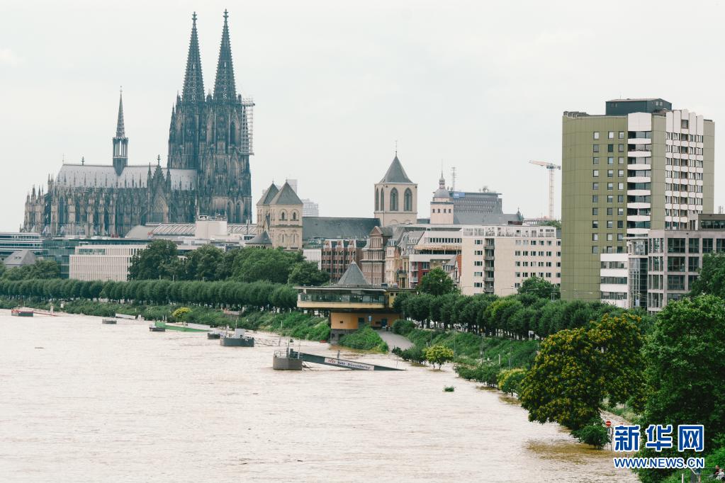這是7月15日在德國(guó)西部城市科隆拍攝的水位上漲的萊茵河。