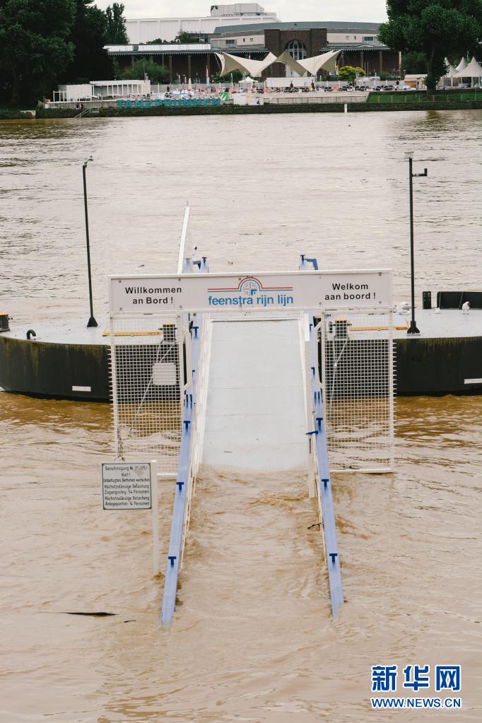 7月15日,在德國西部城市科隆,一處渡口被上漲的萊茵河水淹沒。
