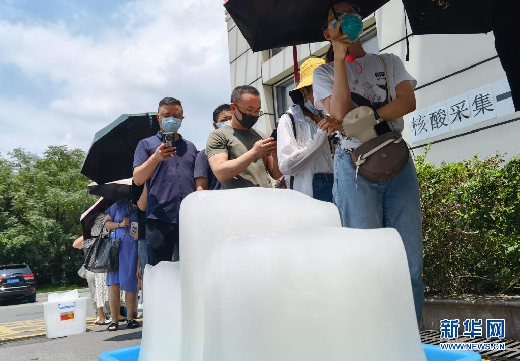 江蘇省南京市于7月21日開始對全市常住人口、外來人員開展全員核酸檢測。目前正值盛夏,氣溫較高,在南京市第一醫(yī)院河西院區(qū)核酸檢測點(diǎn),工作人員專門為排隊(duì)等候的市民準(zhǔn)備了冰塊降溫。