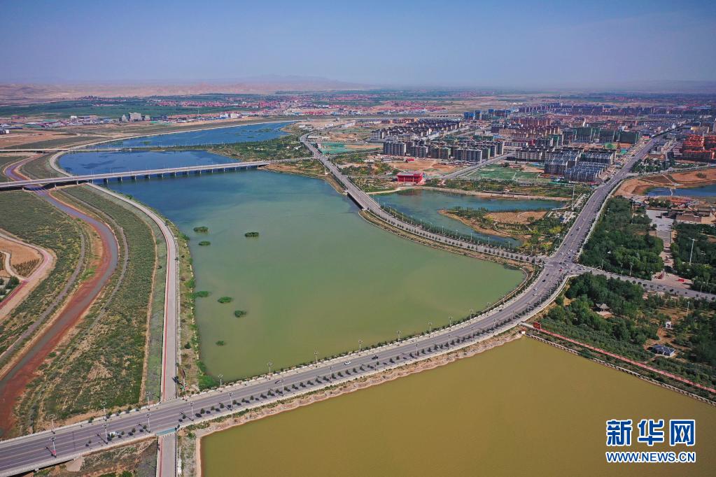 環(huán)繞著寧夏吳忠市同心縣縣城的清水河水系(6月22日攝,無(wú)人機(jī)照片)。新華社記者 王鵬 攝